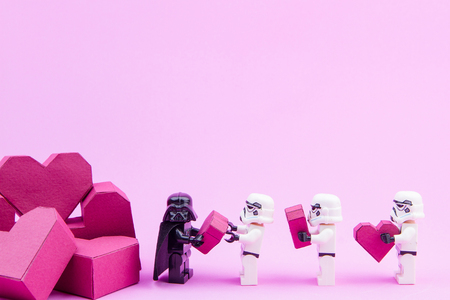 ノンタブリ タイ 17 年 1 月 11 日 レゴ ストームトルーパーは テキストのコピー スペースとピンクの背景にレゴ ダースベーダーに紙箱赤いハート形を与えます コンセプト バレンタインの日 の写真素材 画像素材 Image